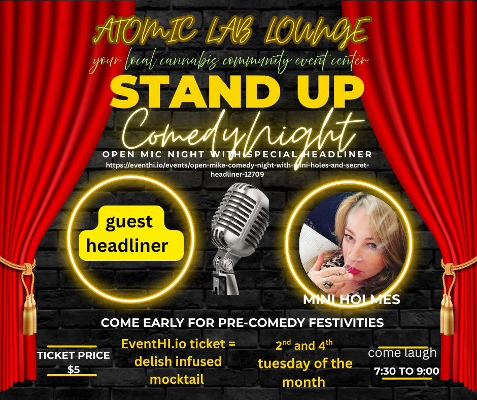 Every 2nd & 4th Tuesday • 7:30 PM – 9:00 PM • Atomic Lab Lounge Get ready for a night of bold jokes and good vibes. Hosted by Mini Holmes — a Coachella Valley favorite known for her sharp wit, fearless humor, and dedication to community causes. Mini will be your Mistress of Ceremonies, guiding […]